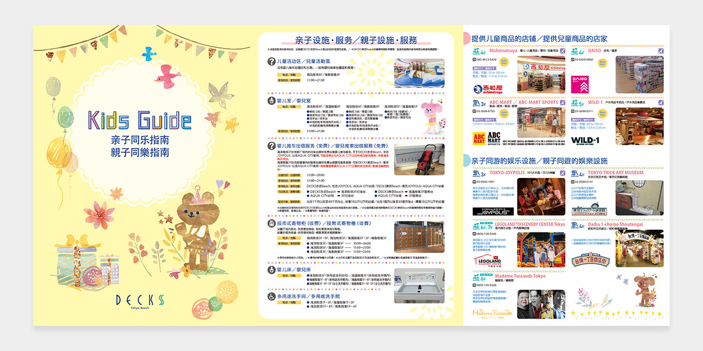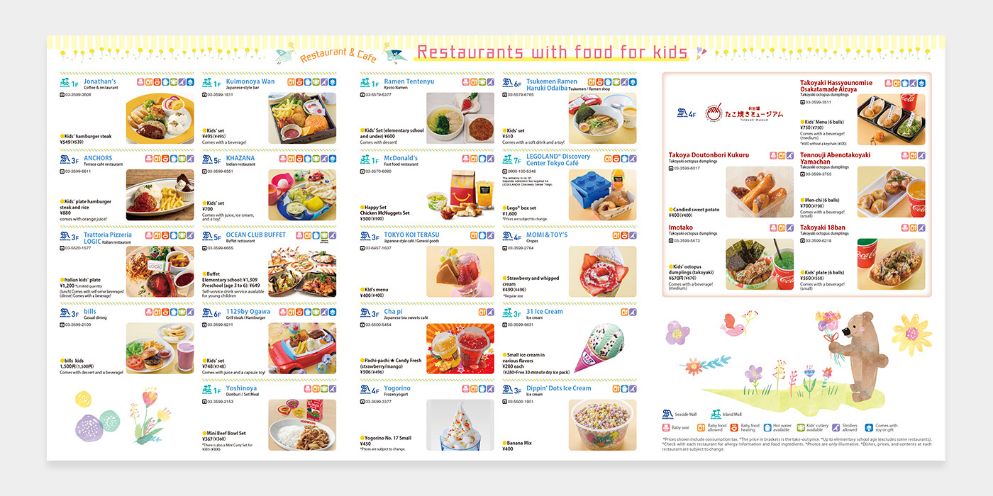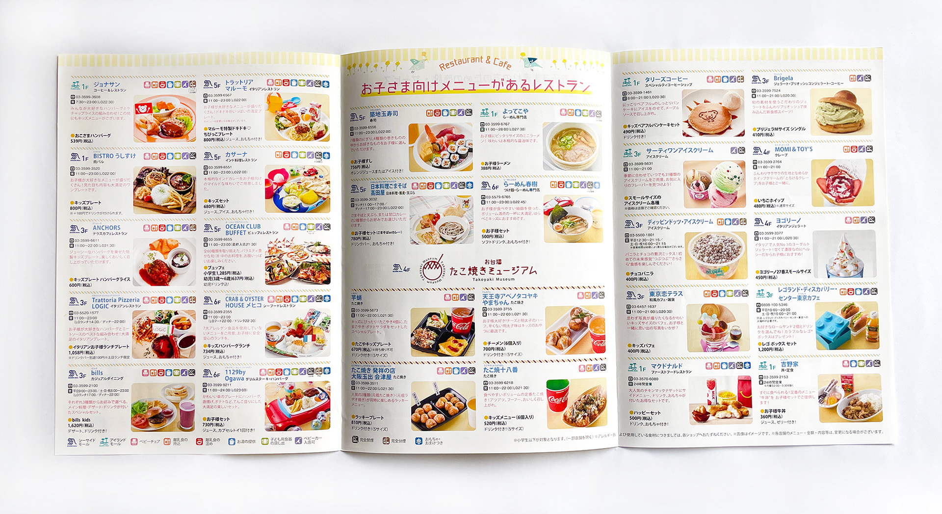 お台場のショッピングモール内施設や飲食店のキッズガイド。掲載店舗とメニュー情報などの原稿と、画像をご提供いただいて制作しました。