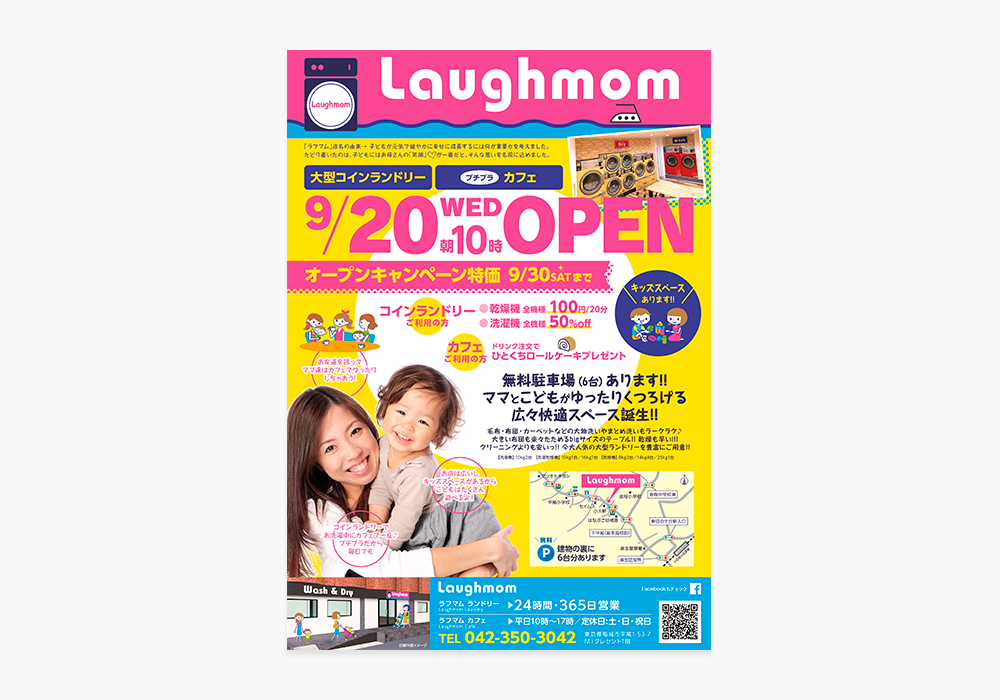 カフェを併設した大型コインランドリーの新規開店告知用チラシ。既存ロゴをご提供いただき、お店のコンセプトとご要望の雰囲気をお伺いして制作しました。