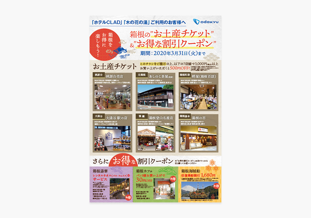 箱根「ホテルCLAD」「木の花の湯」チケット&クーポン付きフライヤー。画像、原稿をご提供いただき、施設の雰囲気に合わせて制作しました。