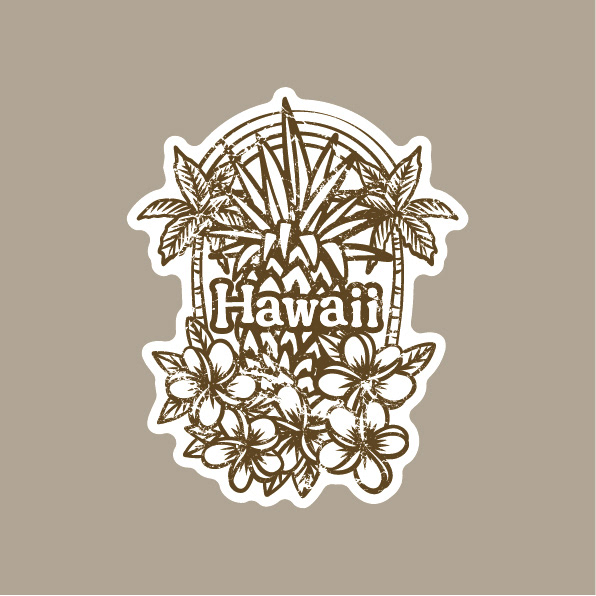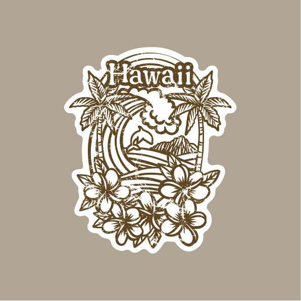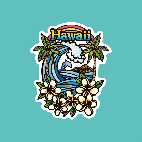 ハワイをテーマに、さまざまなモチーフを詰め合わせたデザインにしました。 鮮やかなフルカラーとビンテージ風の2種類ずつ制作しました。