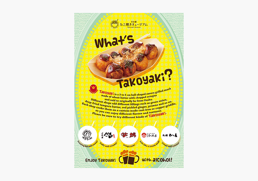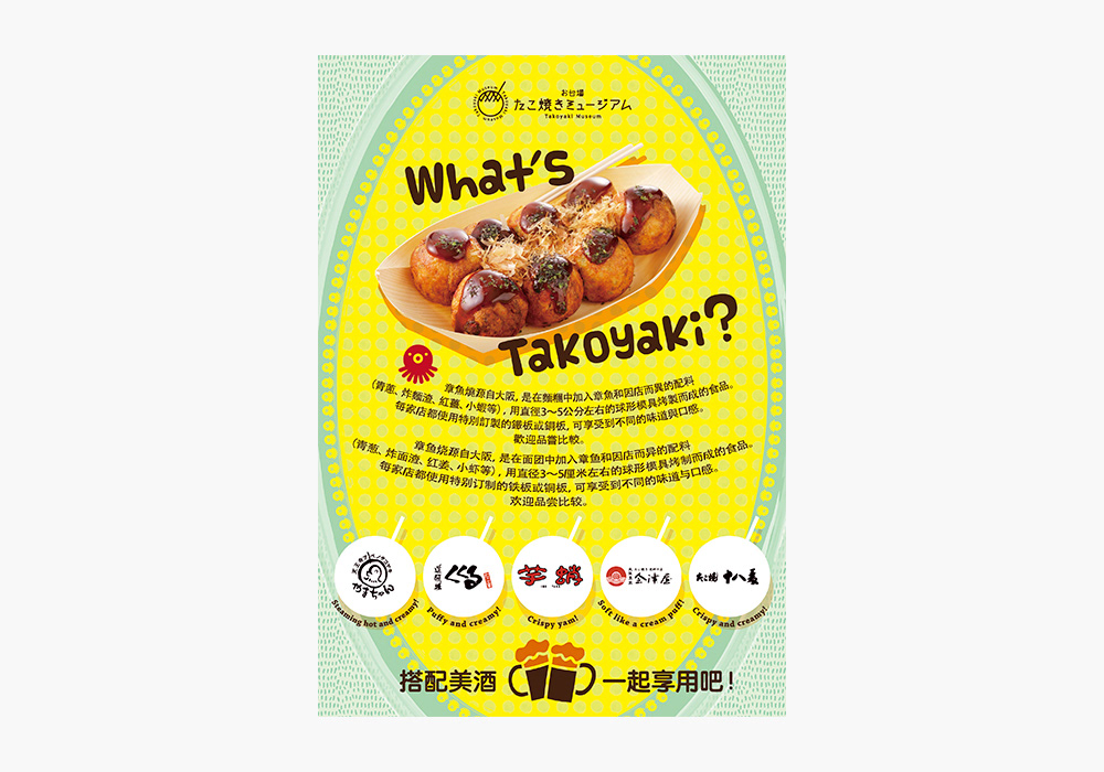 DECKS東京ビーチ内「お台場たこ焼きミュージアム」英語版・中国語版のポスター。画像と原稿をご提供いただき、施設の雰囲気に合わせて制作しました。