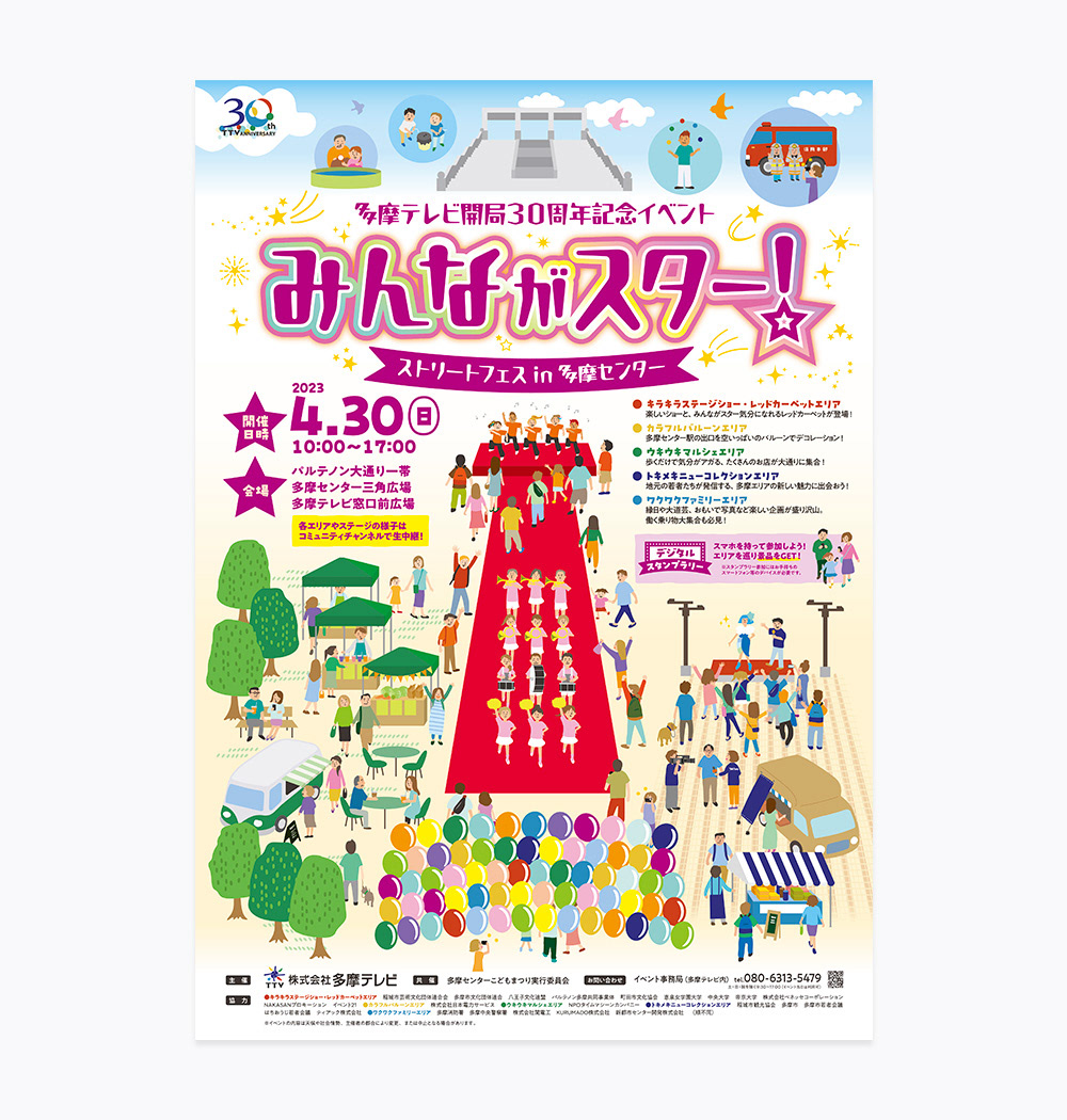 多摩テレビ開局30周年記念イベント告知用広告。ご要望のイメージをお伺いしてイラストの制作、およびテキストと画像をご提供いただきデザイン制作をしました。